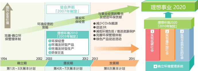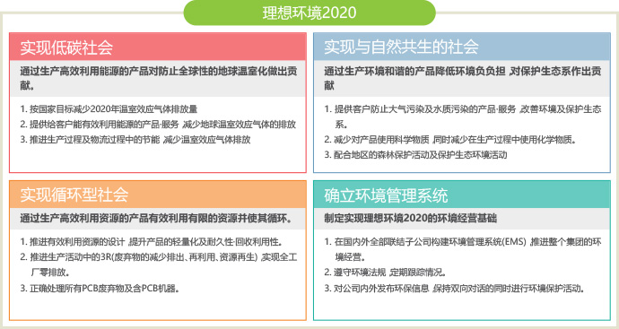 基于环境宪章的基本理念,在理想环境2020中,以「实现低碳社会」「实现循环型社会」「实现与自然共生社会」这3个理念,及作为实现此理念的基础的「确立环境管理系统」这4项为基本方针,谋求事业经营及环境经营活动的一体化的同时对可持续性社会作出贡献。