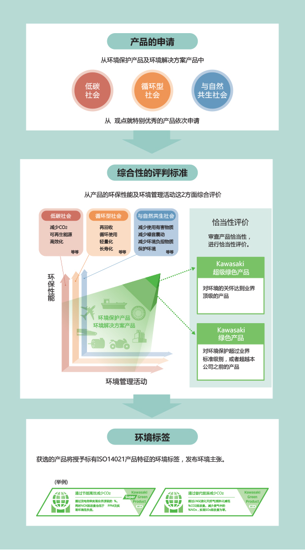 此次的「Kawasaki绿色产品」是为实现集团使命,提升产品本身的环境性能及加速减少生产过程中的环境负荷。将满足我司独立制定的标准的产品作为「Kawasaki绿色产品」或「Kawasaki超级绿色产品」进行恰当性评价后,遵循ISO14021对外发布。