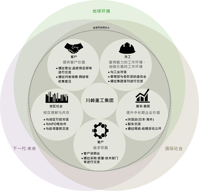 利益相关方沟通 我公司集团积极理解并致力于通过企业活动来解决及实现利益相关方的期望,创造社会价值,提升企业价值。除对各个利益相关方进行个别沟通外,还针对各个相利益相关方描绘本集团的「目标姿态」、制定行动计划、传达PDCA周期。 联系我们 如果您需要有关业务的更多信息,请随时与我们联系。 联系我们 企业资讯 研究•开发 可持续发展 社长致辞 川崎重工集团的CSR(社会责任) 川崎重工集团的集团使命及CSR(社会责任)利益相关方沟通CSR策略对应及关于「2016中期经营计划」的中期目标设定CSR(社会责任)活动组织 课题1:通过事业来创造价值 课题2:管理 课题3:从业人员 课题4:与环境的融合 课题5:社会贡献 与集团外部的交流 财务政策 CSR采购 有关日本东部大地震 Kawasaki Report CSR报告 CSR News 材料采购川崎绿色产品(Kawasaki Green Products) 经营概况 招聘信息 新闻・活动 Stories